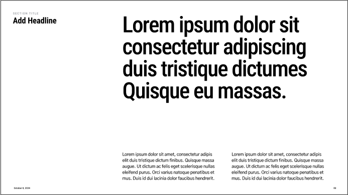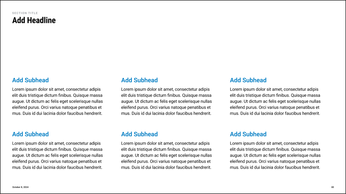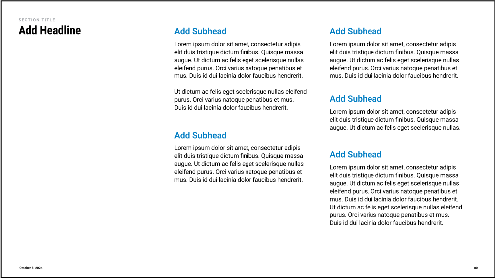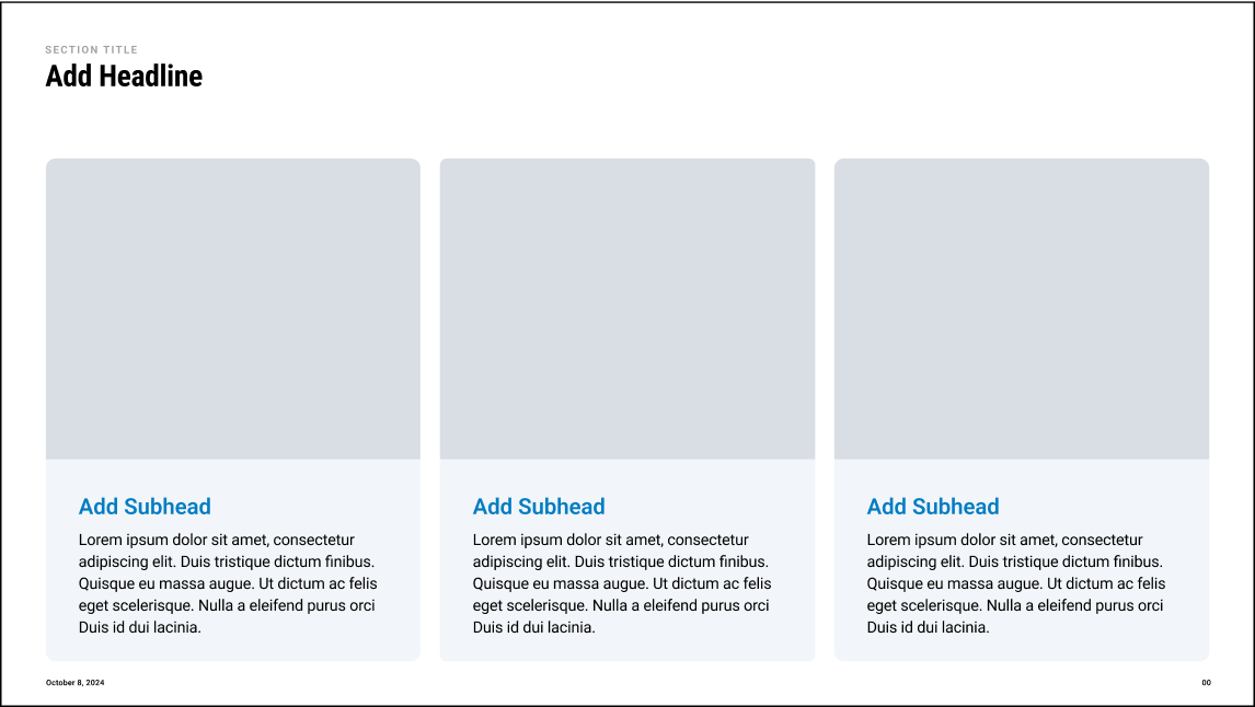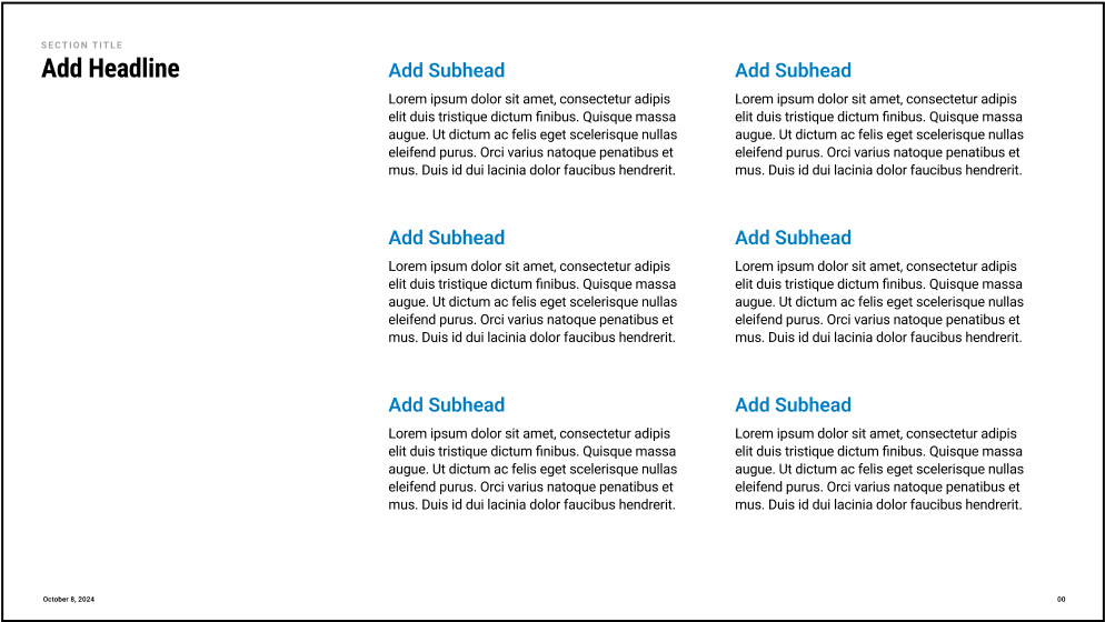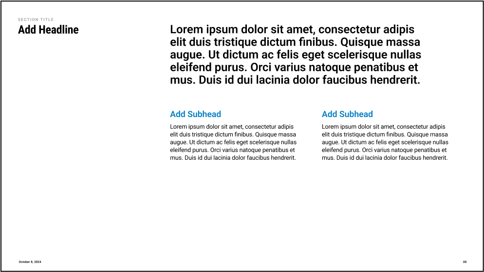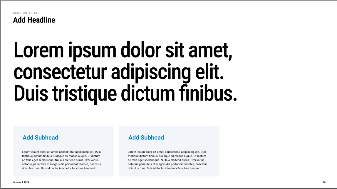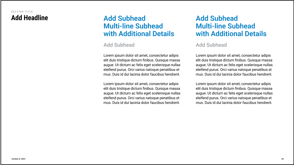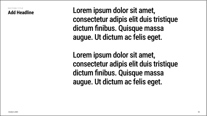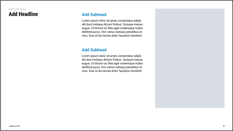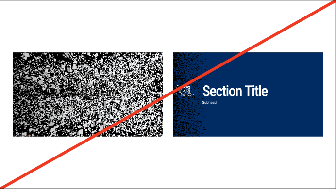Templates that include these assets exist on two platforms: PowerPoint and Slides.com. Each platform has merits and considerations, but these guidelines apply broadly to both.