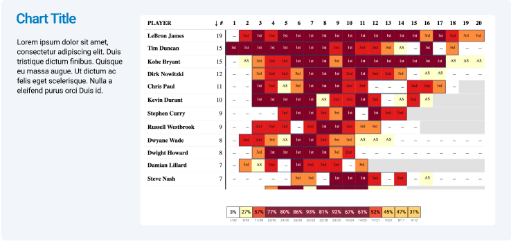 We can use Caveat to draw emphasis certain data points or narrative overlays. This handwritten typeface contrasts Roboto and relates to the language of the sport.